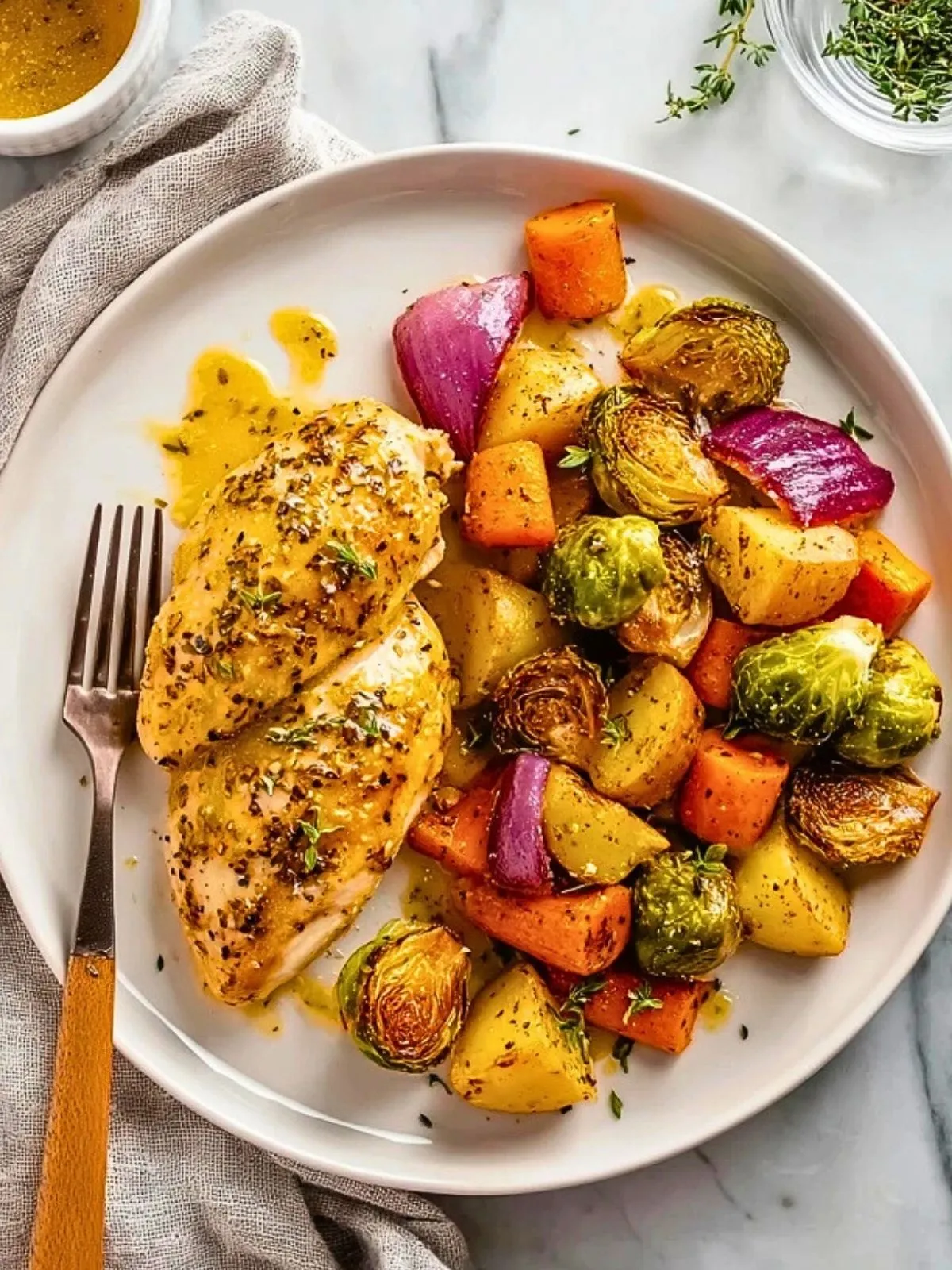 Saftiges Hähnchenfilet aus dem Ofen, umgeben von geröstetem Rosenkohl und Kürbis, abgerundet mit einer süß-würzigen Honig-Dijon-Senf-Marinade. Perfekt für ein unkompliziertes Abendessen mit wenig Abwasch und maximalem Geschmack.