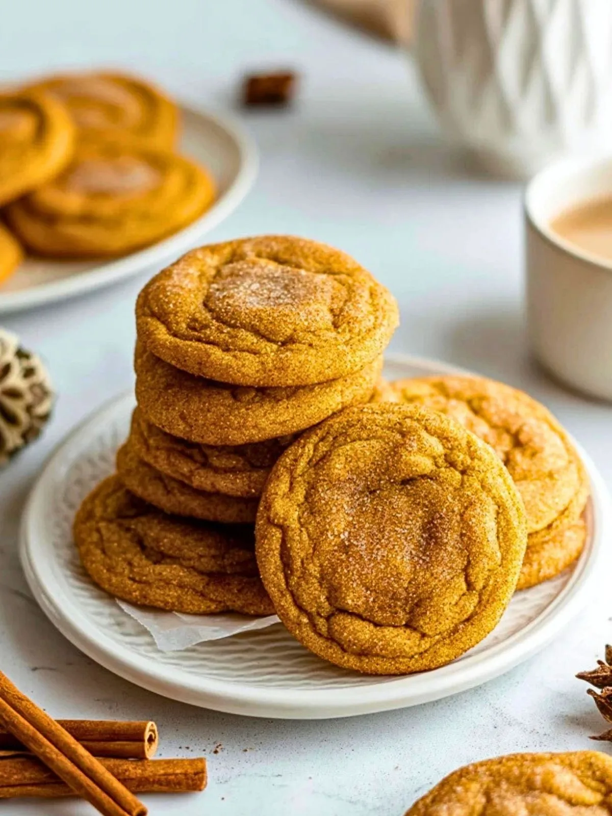 Saftige, weich-zähe Braune Butter Kürbis Snickerdoodle Plätzchen mit Zimt-Zucker-Mantel – perfekt für gemütliche Herbsttage und die Adventszeit.