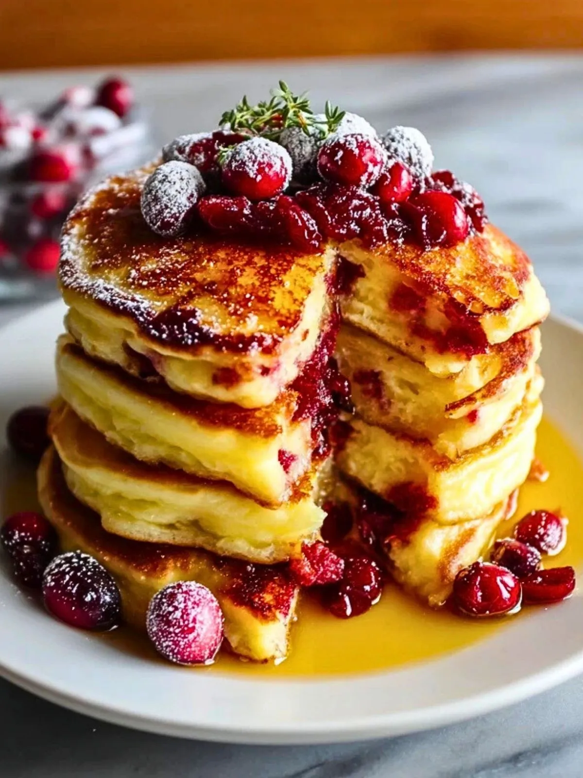 7. Warm mit Ahornsirup, zusätzlichen Cranberrys und Puderzucker servieren.