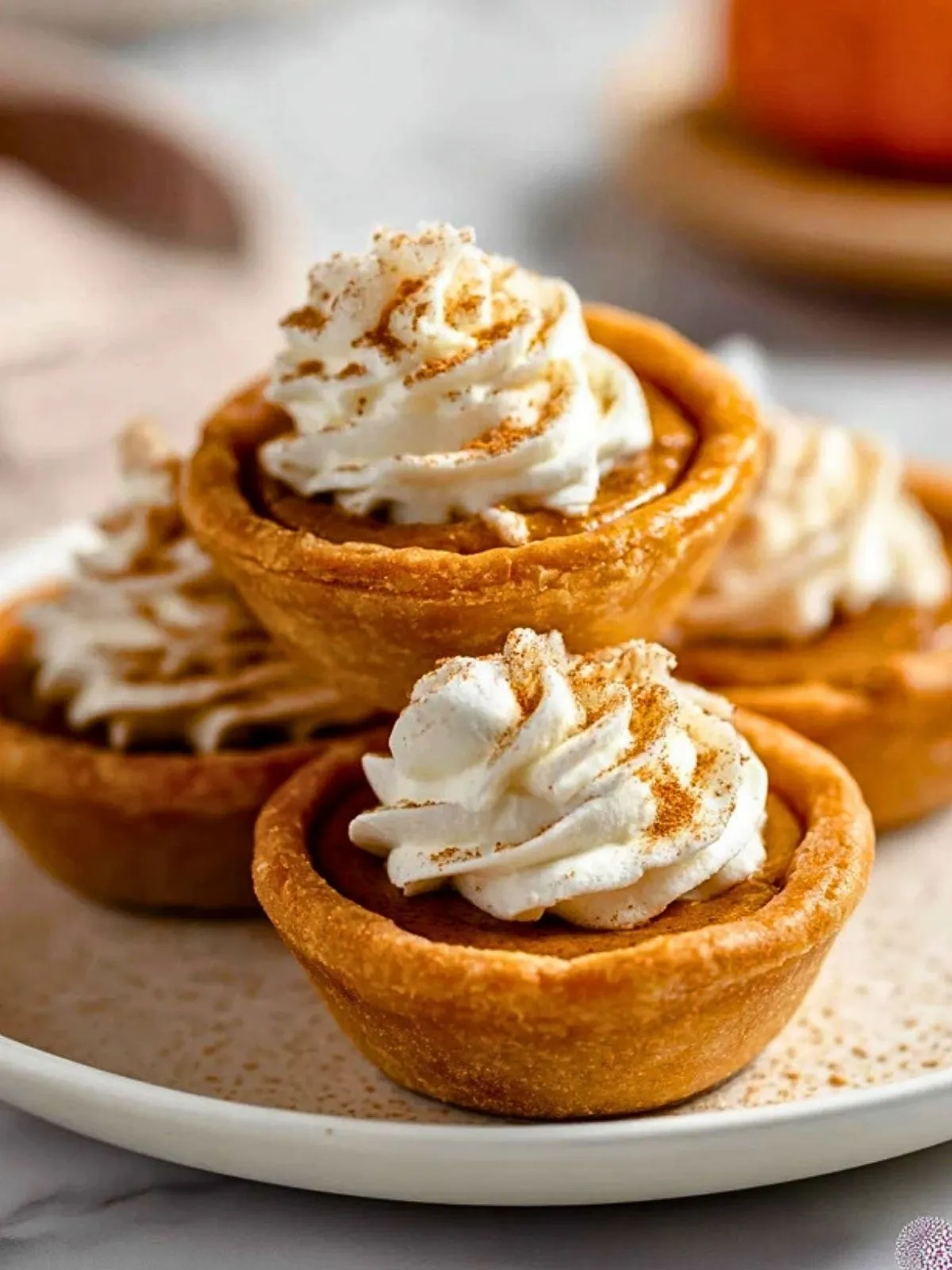 Lasse die Mini Kürbiskuchen im Blech abkühlen, bevor du sie vorsichtig herausnimmst. Mit einem Klecks Schlagsahne und etwas Zimt bestreut servieren.