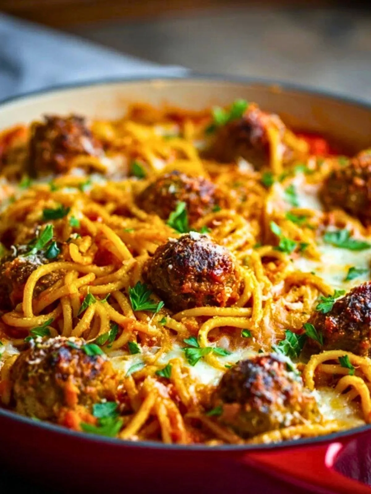 Ein wunderbar herzhafter Nudelauflauf aus Spaghetti, saftigen Fleischbällchen, aromatischer Tomatensauce und einer goldenen Käseschicht. Perfekt für die ganze Familie und ideal zum Vorbereiten oder Einfrieren – dieser Klassiker sorgt garantiert für Begeisterung!