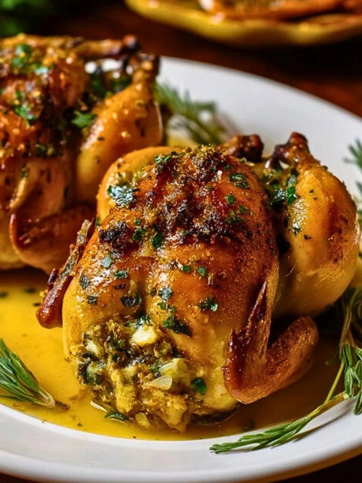 Gefüllte Cornish-Hühner sind ein echter Festtagsklassiker: Zarte kleine Hähnchen werden mit einer aromatischen Kräuter-Brot-Füllung versehen und im Ofen goldbraun gebraten. Das Ergebnis ist unglaublich saftiges Fleisch mit knuspriger Haut – perfekt für besondere Anlässe oder als Highlight beim Sonntagsessen.