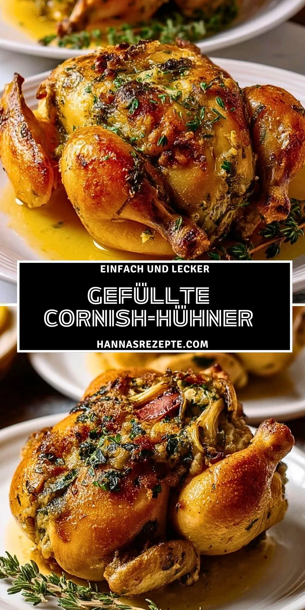 Durch ihre handliche Größe eignen sich Cornish-Hühner perfekt als Einzelportion pro Gast und machen beim Servieren ordentlich was her. Die Füllung hält das Fleisch wunderbar saftig und sorgt für eine feine Würze. Ob für ein elegantes Dinner oder als besonderer Leckerbissen zwischendurch: Dieses Rezept begeistert große und kleine Genießer gleichermaßen.