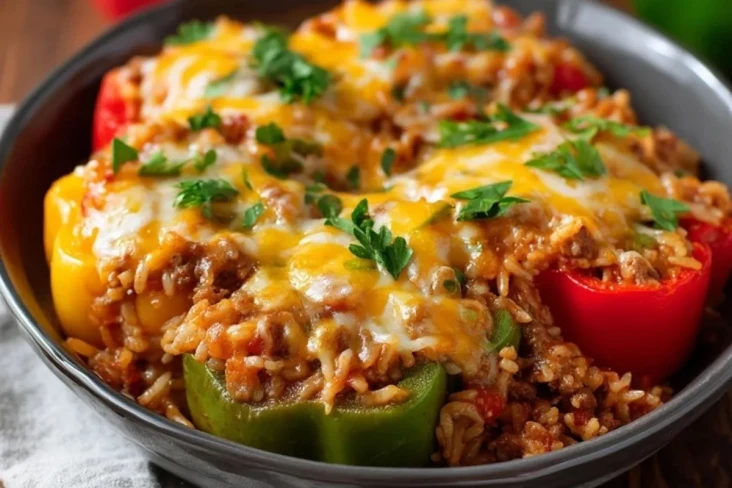 Dieser Gefüllte Paprika Auflauf vereint alles, was wir an klassischen gefüllten Paprikaschoten lieben: Saftiges Hackfleisch, zarter Reis, bunte Paprika und eine fruchtige Tomatensauce, überbacken mit geschmolzenem Käse. Perfekt für die Familienküche oder Meal Prep!