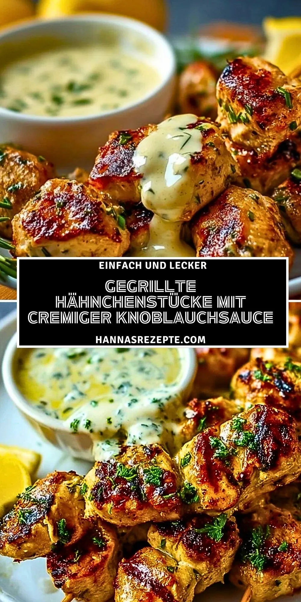Saftig gegrillte Hähnchenstücke mit einer herrlich cremigen Knoblauchsauce sind das perfekte Gericht für ein sommerliches Grillfest, aber auch als schnelles Abendessen ein absoluter Genuss. Die aromatische Marinade sorgt dafür, dass das Hähnchen besonders zart und würzig wird, während die Sauce aus frischem Knoblauch und Kräutern alles abrundet.