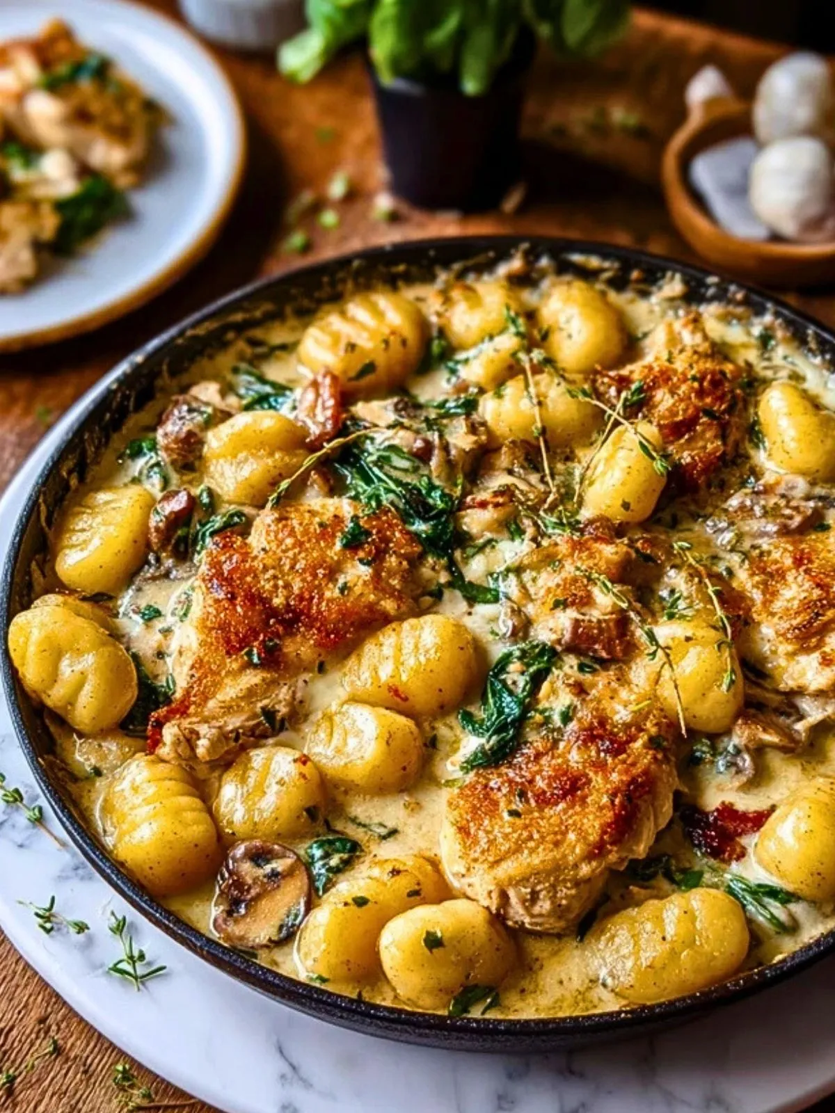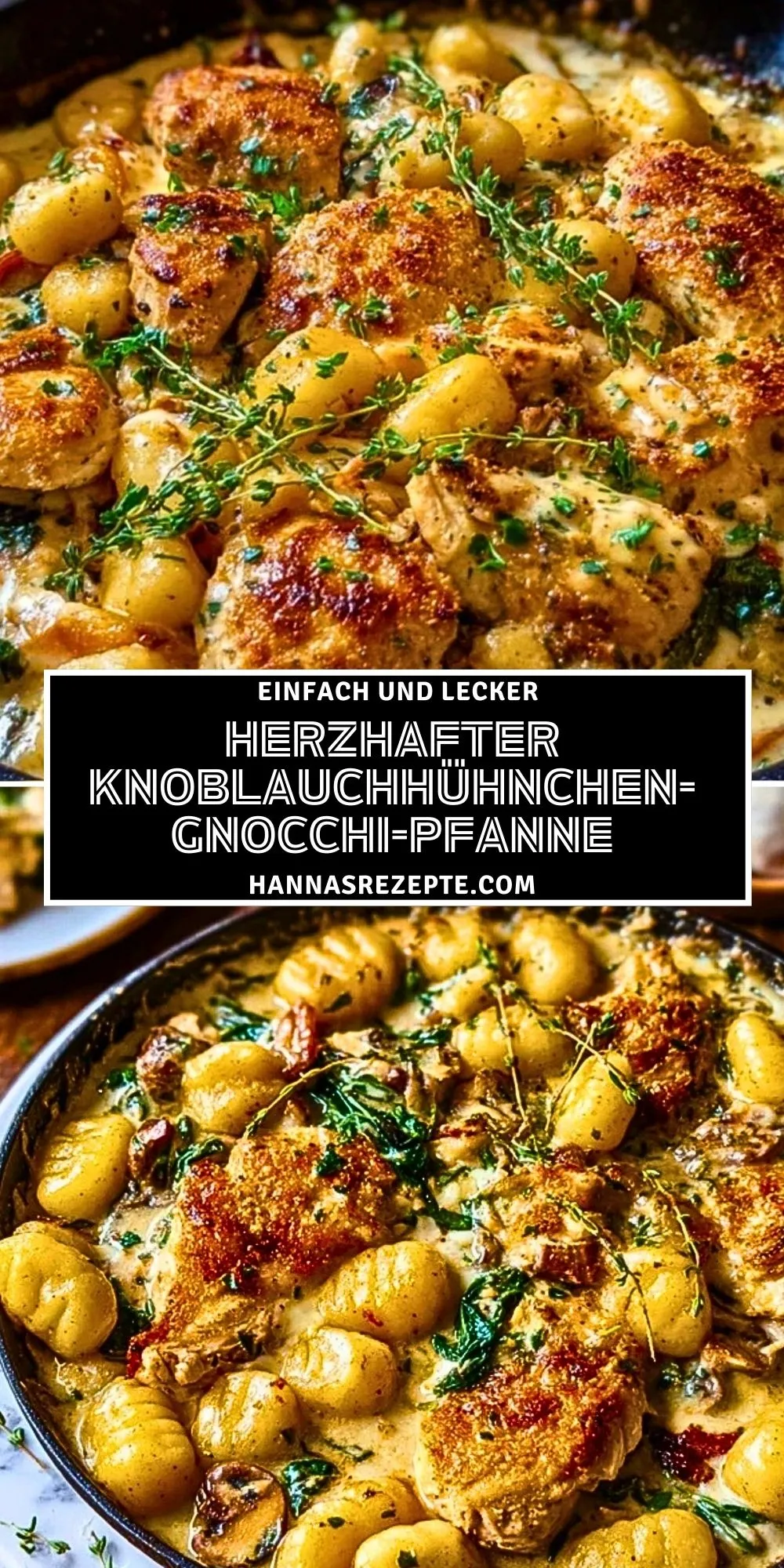 Diese herzhafte Knoblauchhühnchen-Gnocchi-Pfanne vereint zartes Hähnchen, cremige Knoblauchsauce, frischen Spinat und fluffige Gnocchi zu einem echten Wohlfühlessen. Perfekt für schnelle Alltagsküche und gesellige Abende!