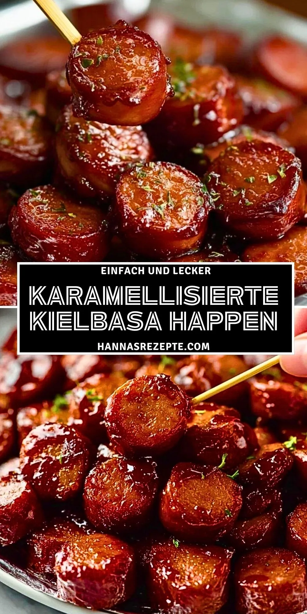 Karamellisierte Kielbasa Happen sind der perfekte Party-Snack! Saftige Wurstscheiben werden in einer süß-würzigen Sauce aus braunem Zucker, Honig, Senf und Sojasauce goldbraun karamellisiert. In wenigen Minuten zubereitet und ideal als Fingerfood für Gäste, zum Brunch oder gemütlichen Fernsehabend.