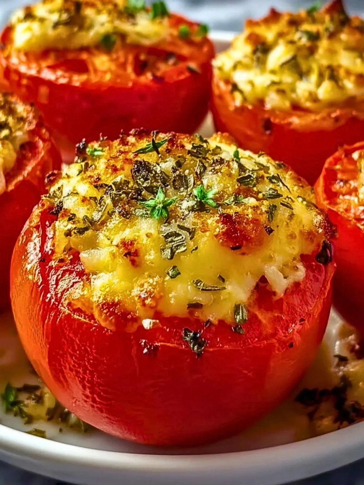 Käsegefüllte Tomaten schmecken frisch aus dem Ofen am besten – schön heiß mit geschmolzenem Käse und aromatischen Kräutern. Du kannst sie als vegetarisches Hauptgericht servieren oder als Beilage zu Fisch oder Fleisch reichen. Reste lassen sich gut abgedeckt im Kühlschrank für 1–2 Tage aufbewahren und schmecken auch am nächsten Tag, kurz im Ofen aufgewärmt, noch köstlich.