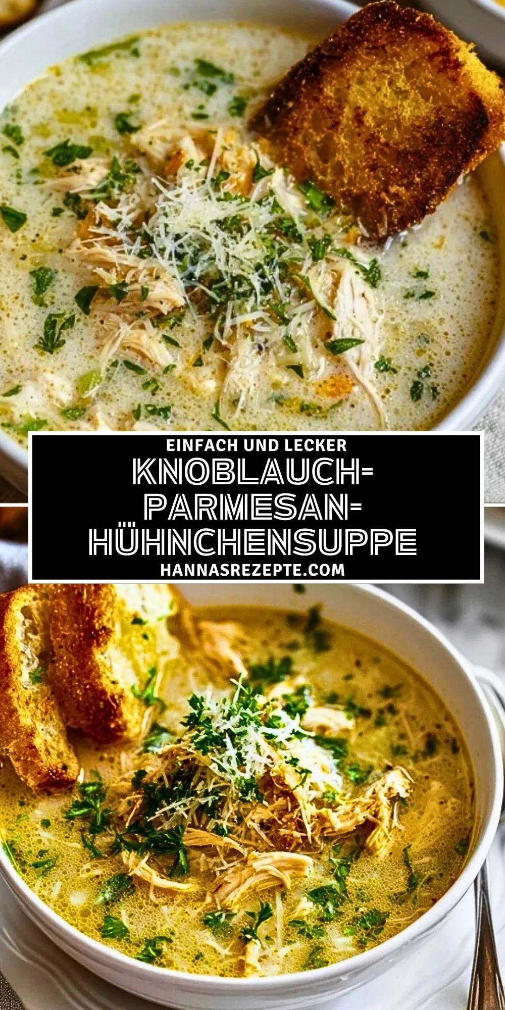 Diese Knoblauch-Parmesan-Hühnchensuppe vereint cremige Konsistenz, zartes Hühnchen und kräftigen Parmesan zu einer unwiderstehlichen Wohlfühlsuppe. Perfekt für kalte Tage und schnelle Familienküche – mit Brot serviert ein Genuss!