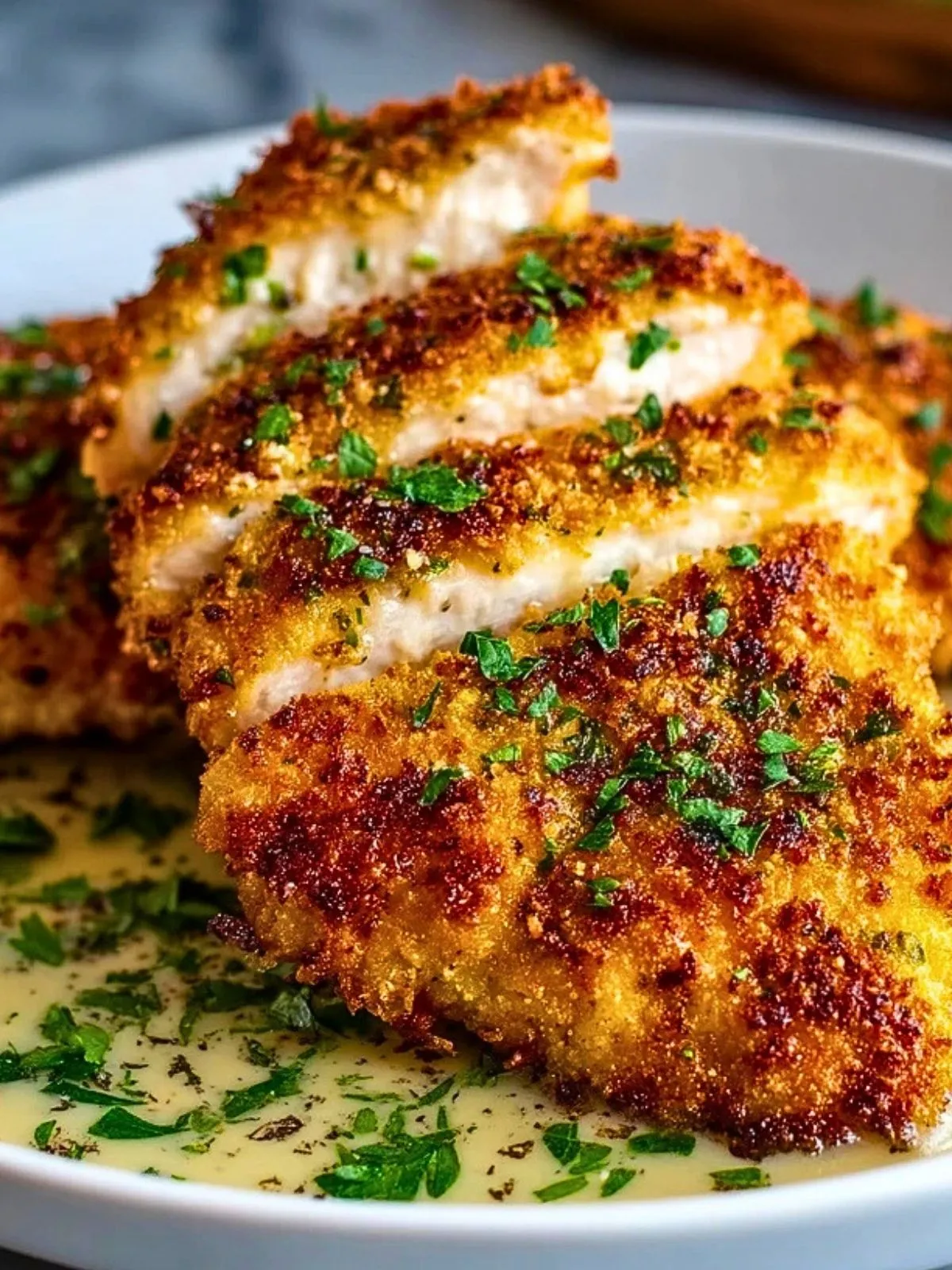 Knuspriges Parmesan-Hühnchen vereint zartes Hähnchenfilet mit einer goldbraunen Parmesankruste und wird mit einer cremigen Kräutersoße serviert. Perfekt für Genießer und ein echter Klassiker für Familienabende oder Gäste!