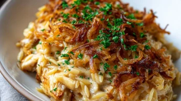 Französischer Zwiebel-Hähnchen-Orzo-Auflauf