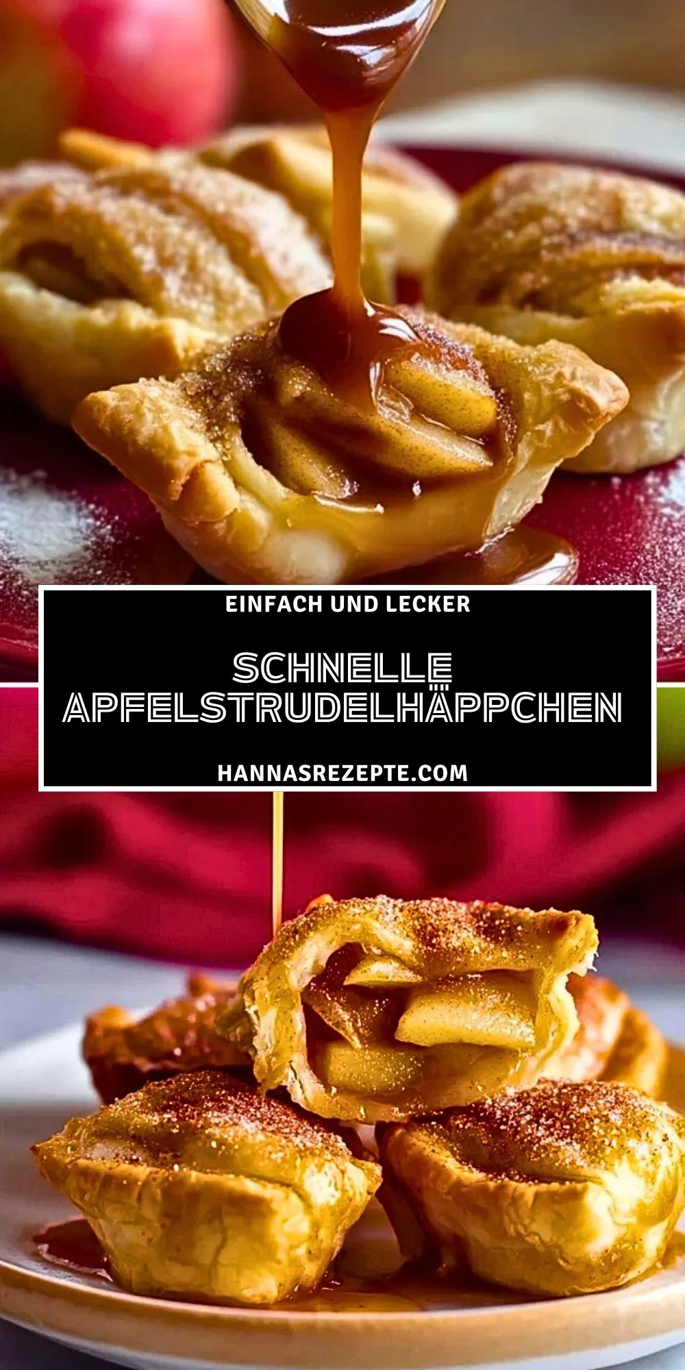 Knusprige, schnelle Apfelstrudelhäppchen – fix aus Blätterteig gemacht, gefüllt mit Apfel, Zimt und Zucker. Ein köstliches Dessert oder süßer Snack, ideal wenn es schnell gehen muss und trotzdem nach traditionellem Apfelstrudel schmecken soll!