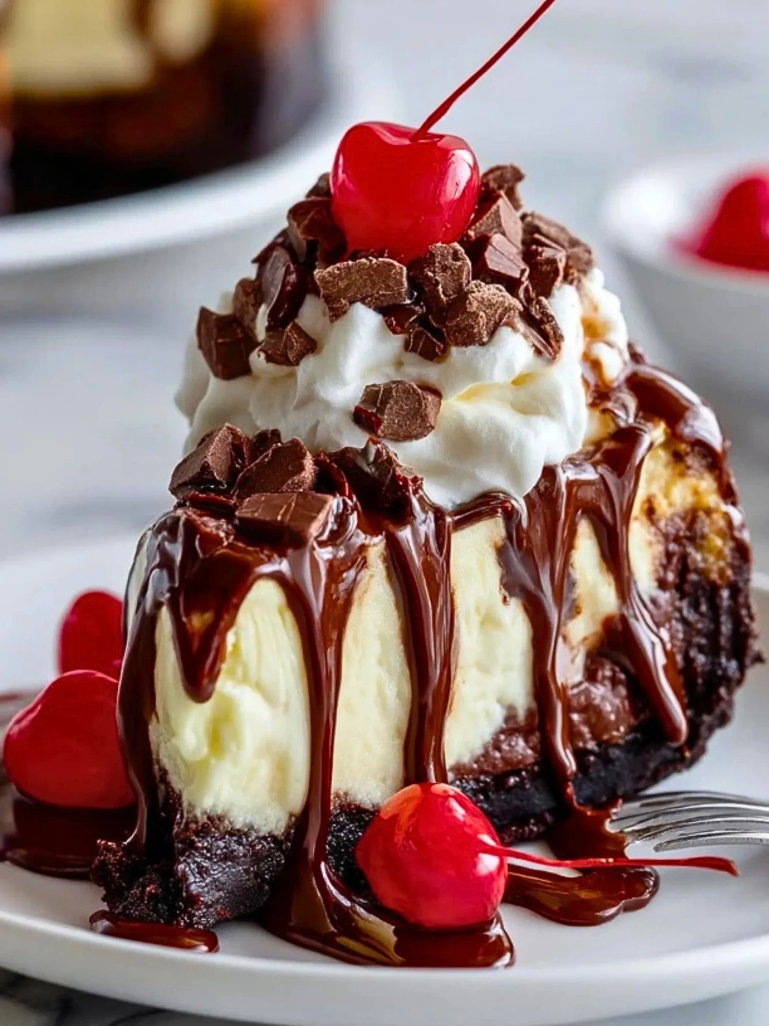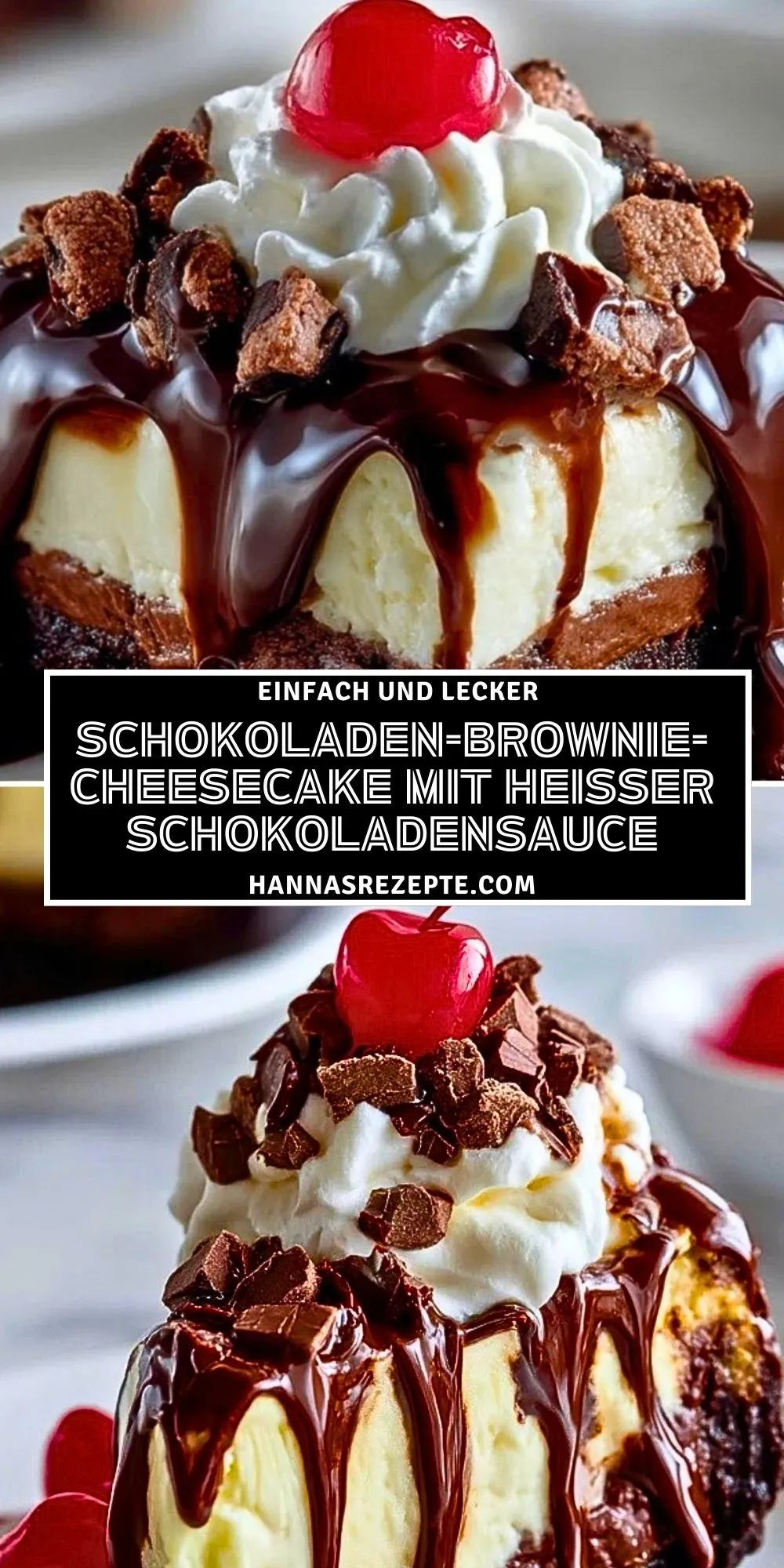 Ein himmlischer Cheesecake mit saftigem Brownie-Boden, cremiger Frischkäse-Schicht und extra heißer Schokoladensauce. Dekoriert mit Sahne, Schokoraspeln und Kirschen – ein Fest für alle Dessert-Liebhaber!