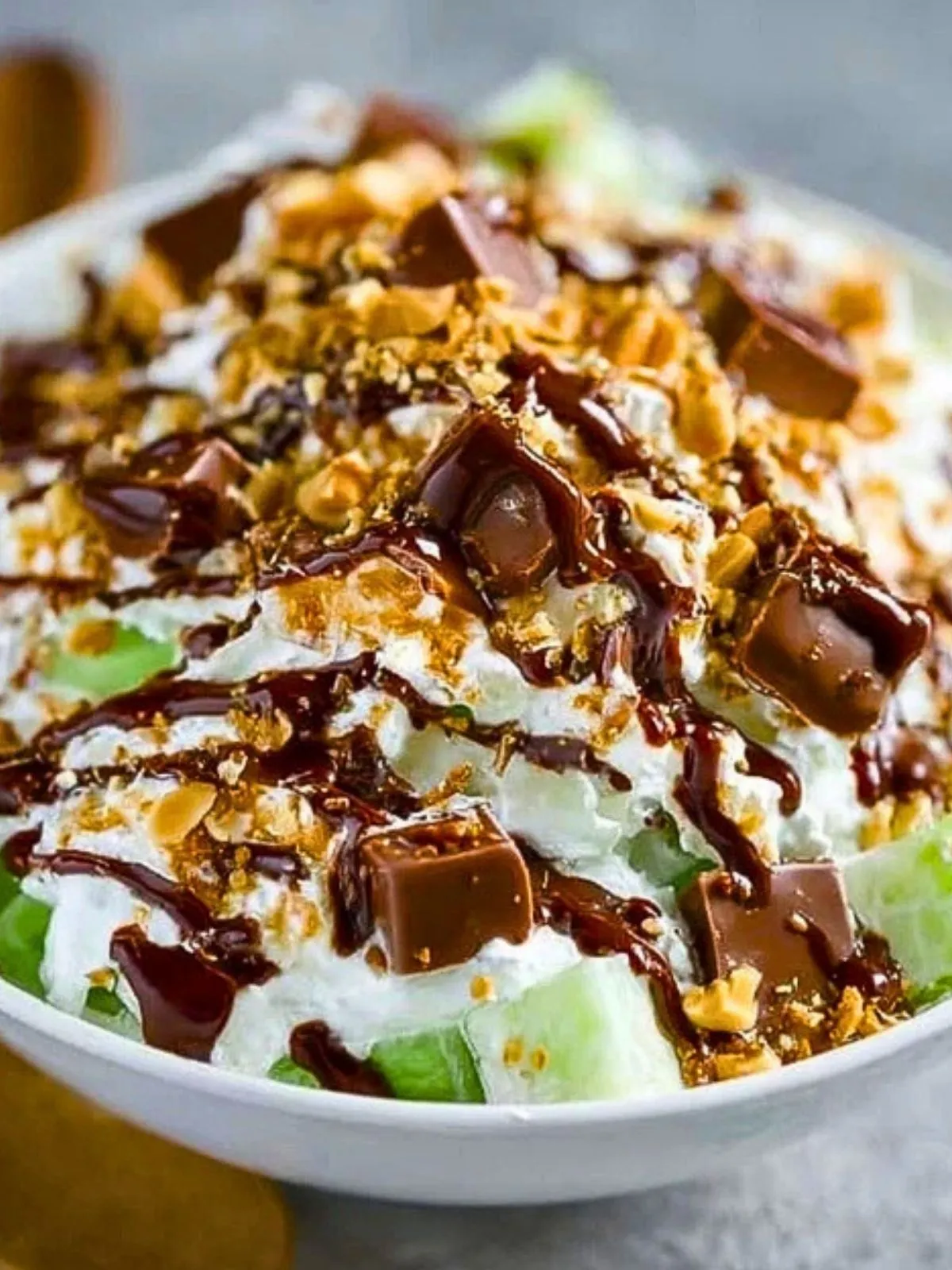 Snickers-Salat ist das perfekte, schnelle Dessert für Partys, Geburtstage oder als Überraschung beim Familienessen. Frische Äpfel, cremige Vanille-Sahne und gehackte Snickers-Riegel ergeben zusammen einen süßen, knackigen Salat, der jedem ein Lächeln ins Gesicht zaubert.