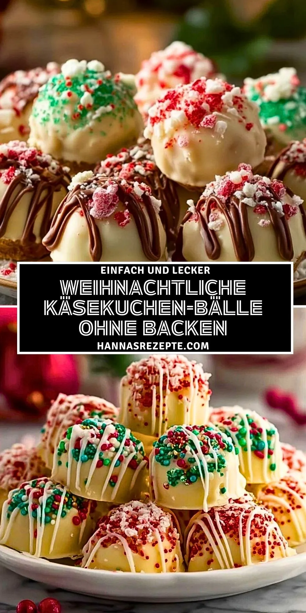 Diese weihnachtlichen Käsekuchen-Bälle ohne Backen sind kleine, cremige Köstlichkeiten, die auf jeder Festtagstafel sofort ins Auge fallen. Mit ihrer zarten Frischkäsefüllung, der feinen Süße und der bunten Dekoration in Rot, Grün und Weiß bringen sie nicht nur Geschmack, sondern auch festliche Stimmung auf den Tisch.